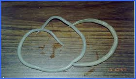 Adult worms are seen as tubular structures outlined by intestinal fluid. The adult worm is seen as a large, curved echogenic strip with an inner, anechoic, longitudinal canal.